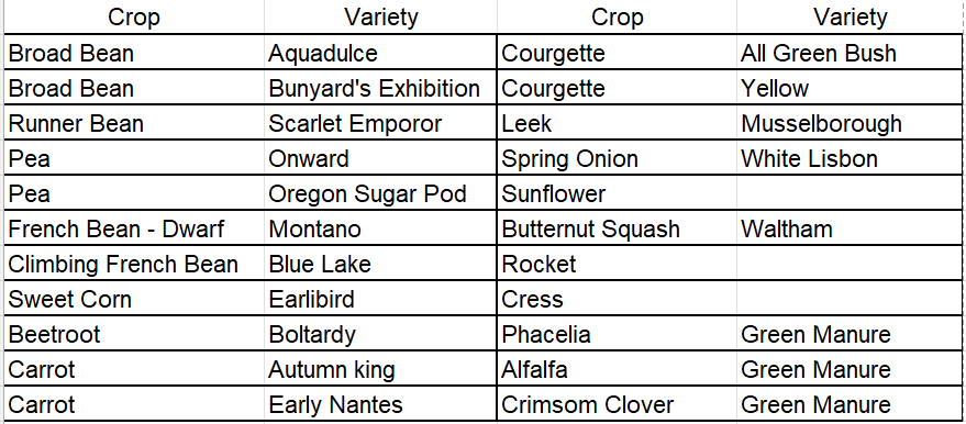 The shop is now open as normal again – 10-12 on Saturday mornings. Potatoes and Fruit Bushes/Plants Thanks to those members who ordered the above, most orders have now been collected although there are several potato orders remaining. It would be helpful if these could be collected shortly – a separate email will be sent to those with orders remaining. We have potatoes / onions and shallots in stock but relatively limited quantities as we aim to sell most by pre-order. Potatoes are £4 per 2KG and onions and shallots are £1.50p / 250g bags. Due to popular demand, we are also stocking smaller packs of Charlotte and Desiree varieties with 5 or 6 tubers per pack (£1/500g). We have limited supplies of these too. These are suitable to be grown in our 30l potato post which have proved very successful for a number of members. Composts for 2026 We have received our delivery form Melcourts and are stocking the same as last year with their standard multipurpose (£7/40l) and with John Innes (£7.50/40l). We also have one pallet (60 bags left) of their new seed and cutting compost which was very popular last year (£7/40l). When we have all the potatoes collected (and so have some room) we will also be buying more Rocketgro products. Seeds Our 30% off offer for Kings is still running (see here for details). Their prices continue to creep up but still offer very good value. We were offered a 50% off deal for Thompson and Morgan but a comparison showed these were still much more expensive than Kings when both discounts were applied and so we will stick with Kings. We have catalogues in the shop if anyone hasn’t been sent one by Kings. Their postage has increased to £2.35 now but members are welcome to place small orders of one or two packets through the shop to avoid this – we will add these to the monthly shop orders. We have also extended the range of ‘bulk’ seeds we offer at 50p to include more of the popular varieties we sold as packets from Kings to offer better value for members. The full list of the varieties we will be stocking through the year is below: |